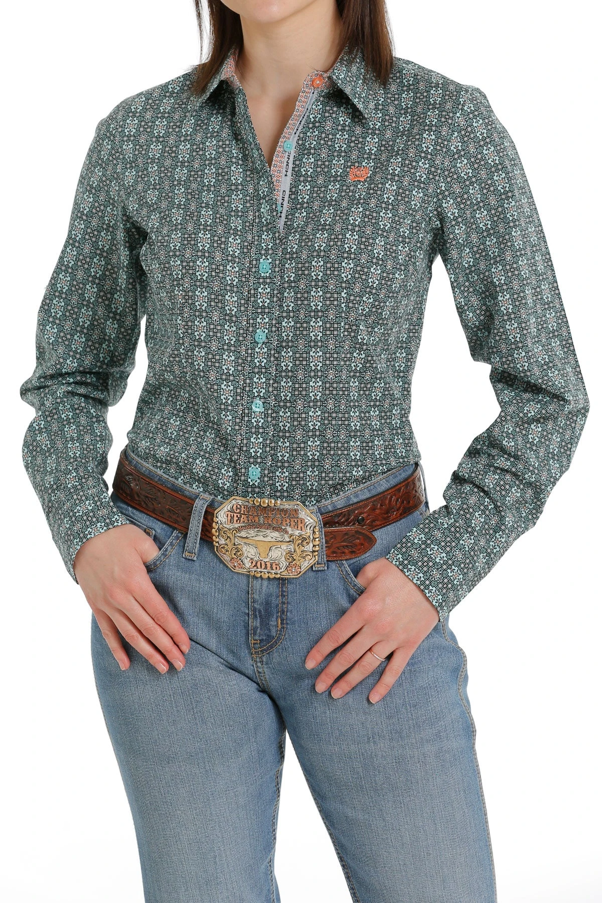 Blue and Light Blue Print Long Sleeve Button Down Shirt.