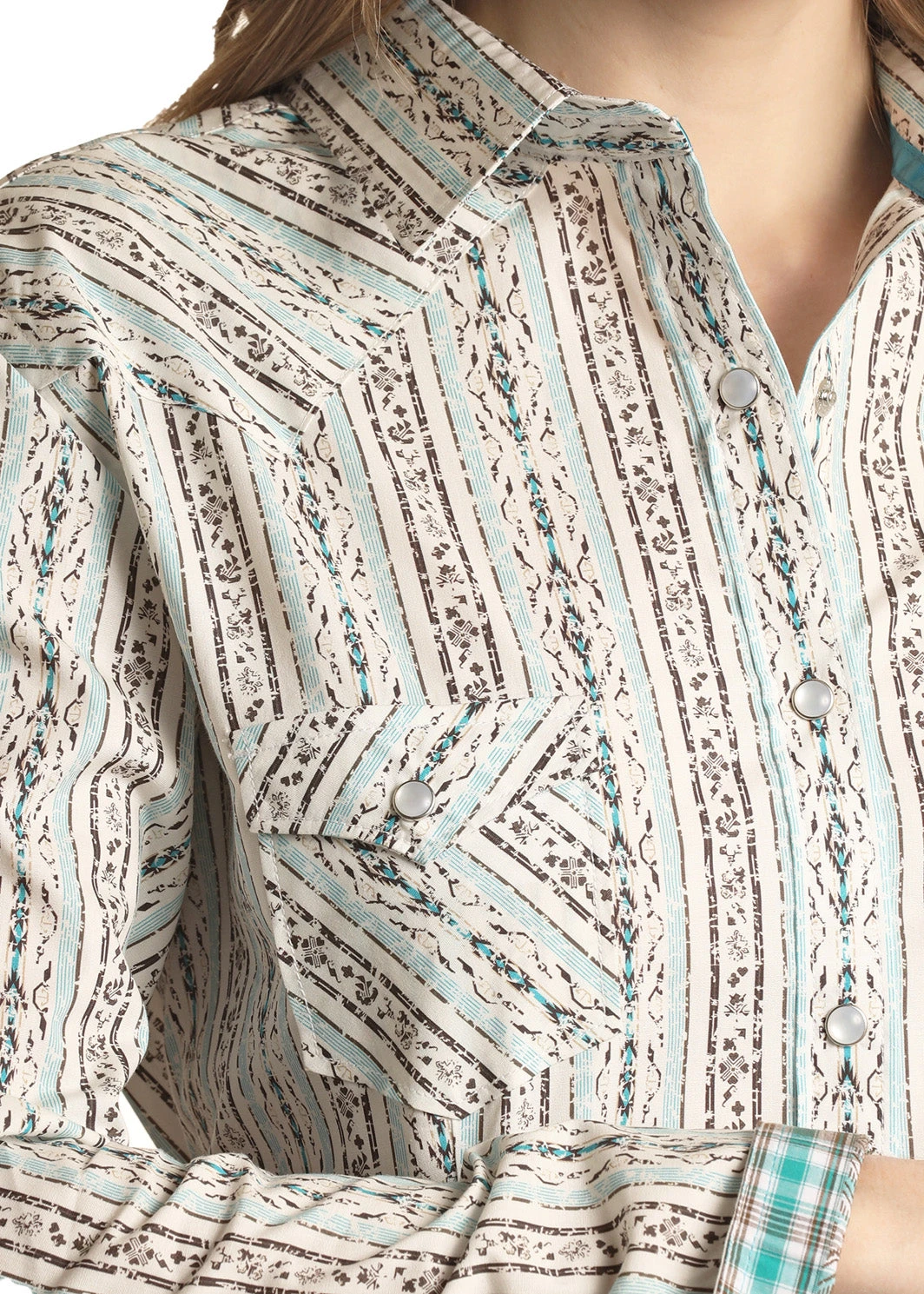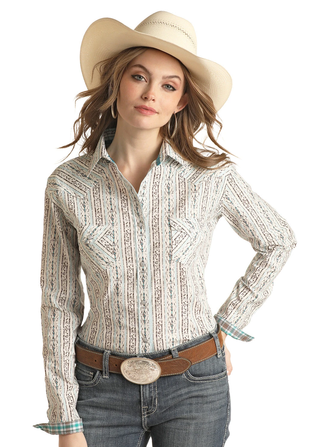Natural with Turquoise and Black Print Stripe Long Sleeve Snap Front Shirt.