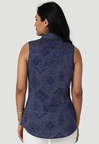 Deep Blue and White Geometric Print Sleeveless Snap Front Shirt.